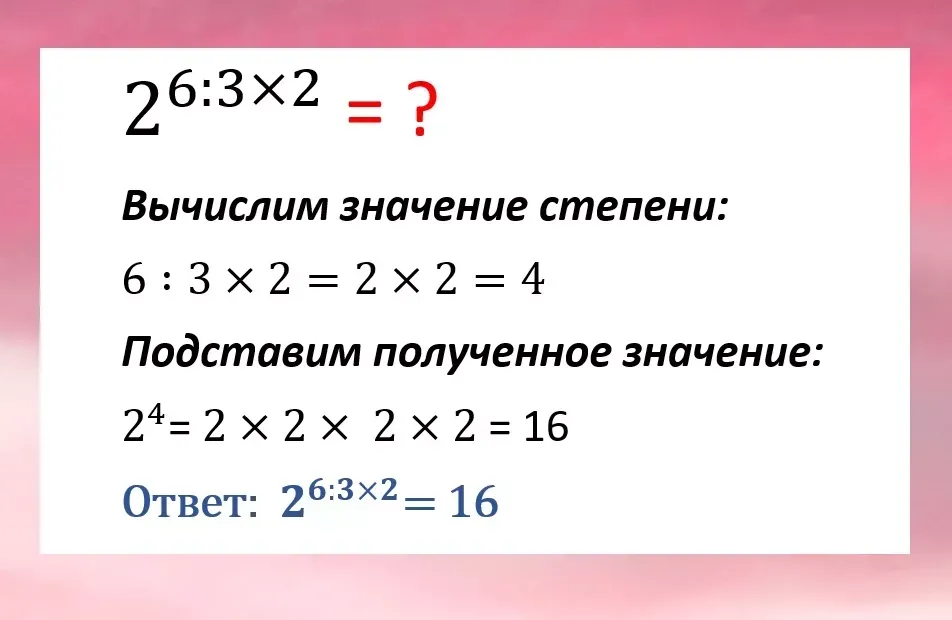 Для начала нам нужно вычислить значение степени. Не забывайте, что деление и умножение имеют равные права и выполняются в одном порядке. Рассмотрим решение: